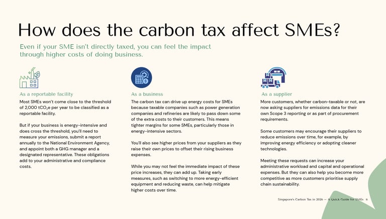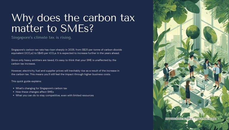 Singapore's carbon tax has risen sharply. SMEs aren't taxed directly, but they'll feel it through higher business costs and growing pressure to reduce and disclose emissions.